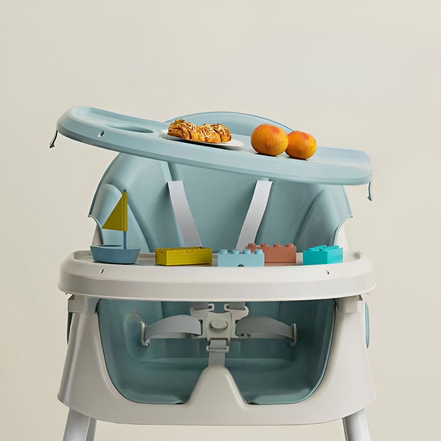 • Compartimentul de depozitare si cele două farfurii sunt detașabile și ușor de curățat: Scaunul vine cu o tavă dublă detașabilă, cu mai multe niveluri, realizată din material alimentar. O tavă canelată în partea de sus pentru sticle sau tacâmuri și o tavă în partea de jos pentru jucării. În coșul de depozitare puteți plasa obiectele ale bebelușului. Tava și coșul de depozitare sunt detașabile și ușor de curățat.