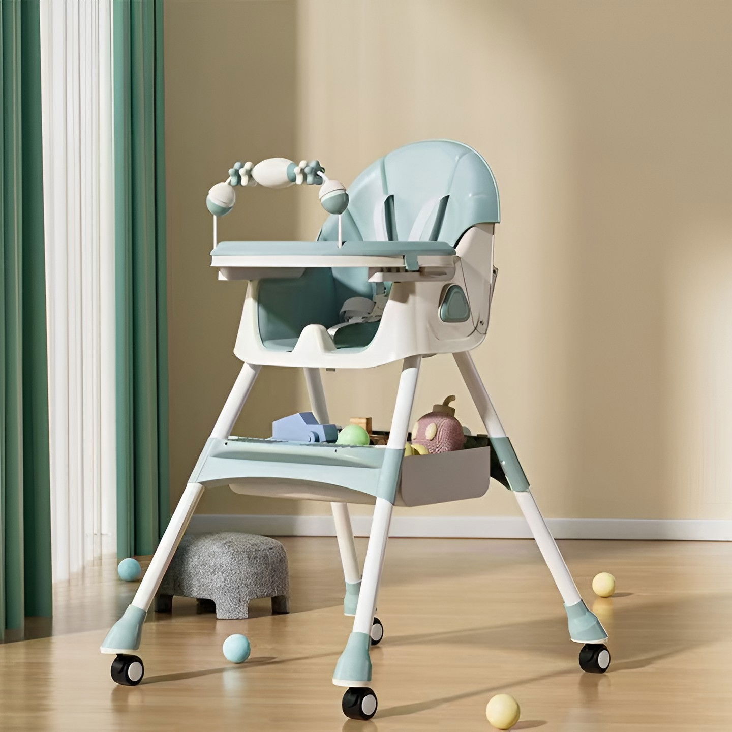 Scaun de Masa pentru Bebelusi si Copii, 2 Tavite si Husa Detasabile, Multifuncțional, Stabil, Centura de Siguranta, Spatar Reglabil Moale, Balansoar, Cos de Depozitare, de la 6 Luni, Turcoaz
