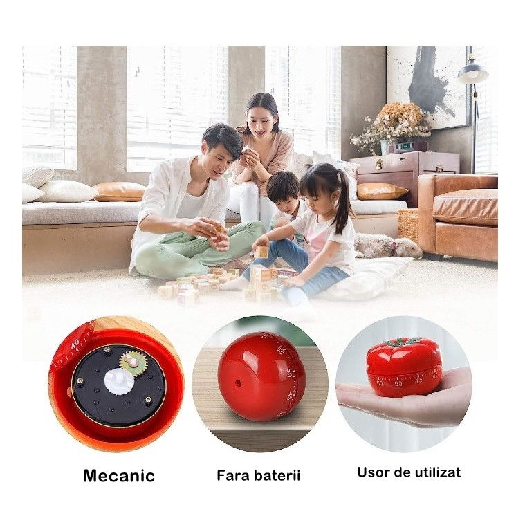 - Formă de roșie: Cronometrul are o formă de roșie, adăugând o notă amuzantă și inovativă bucătăriei tale. Acest design adorabil îl face să iasă în evidență și să aducă un plus de farmec în spațiul de gătit.