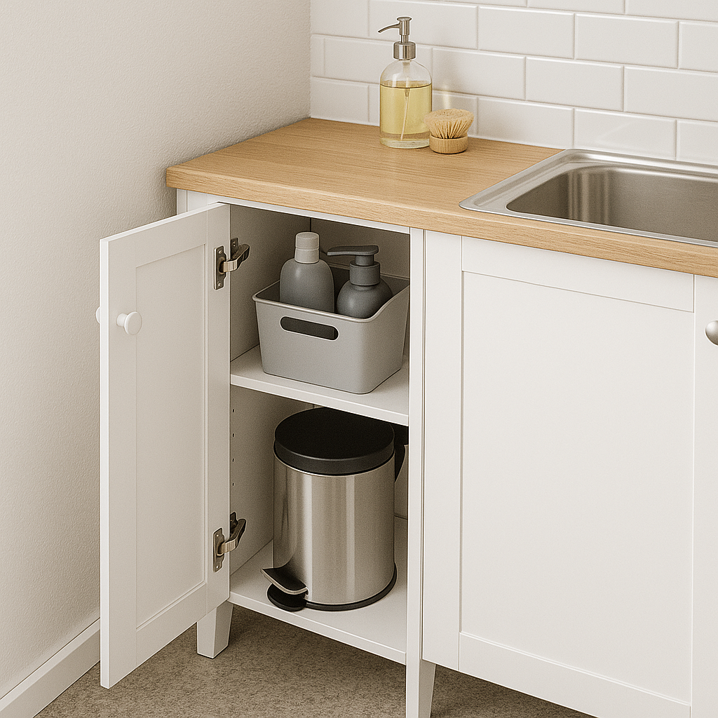 Un dulap mic pentru bucătărie sau un dulap pentru chiuvetă din lemn poate transforma colțurile nefolosite în zone funcționale. Completează cu accesorii de chiuvetă și uși de dulap elegante.