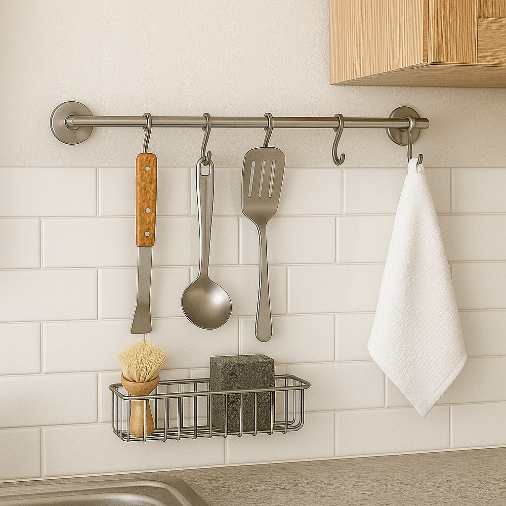 Accesorii precum console pentru chiuvetă sau suport bară haine ovala pot fi folosite creativ în bucătărie. Le poți monta sub dulapuri sau pe laterale, pentru ustensile sau lavete.