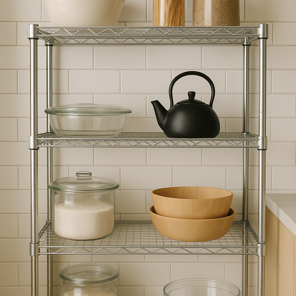 Un raft de bucătărie sau o etajeră de depozitare pot elibera spațiul de pe blatul de lucru. Alege modele de raft cromat sau rafturi suspendate ca să folosești la maximum fiecare centimetru.