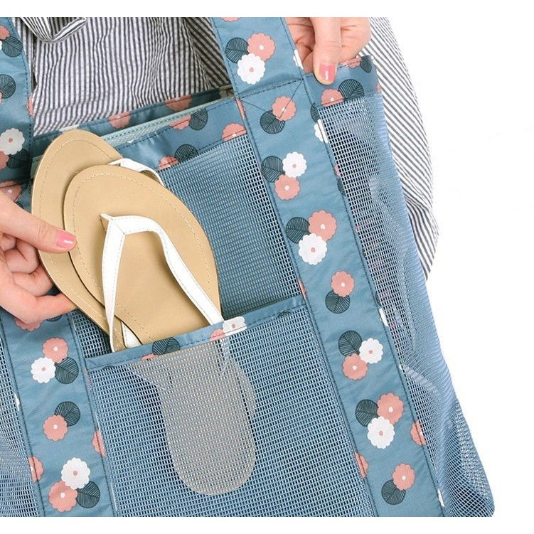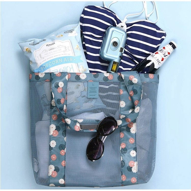 Această geantă este perfectă pentru o zi la plajă, la piscină sau chiar pentru o plimbare relaxantă în oraș. Designul său transparent din plasă permite o vizibilitate ușoară a conținutului, în timp ce imprimeul floral aduce o notă de prospețime și stil.