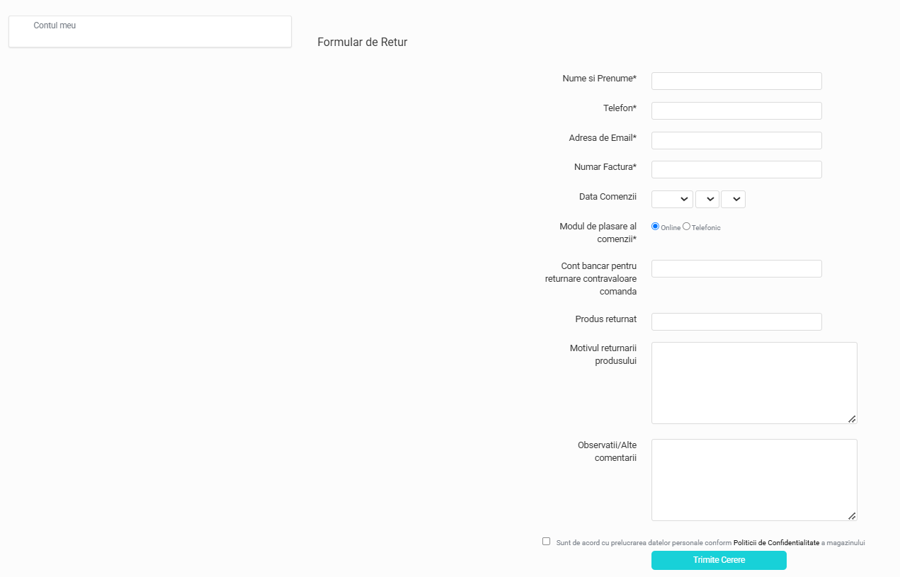 *Pentru comenzile achitate ramburs (cash la livrare), rambursarea se va face exclusiv prin transfer bancar. În acest caz, te rugăm să ne furnizezi următoarele informații: