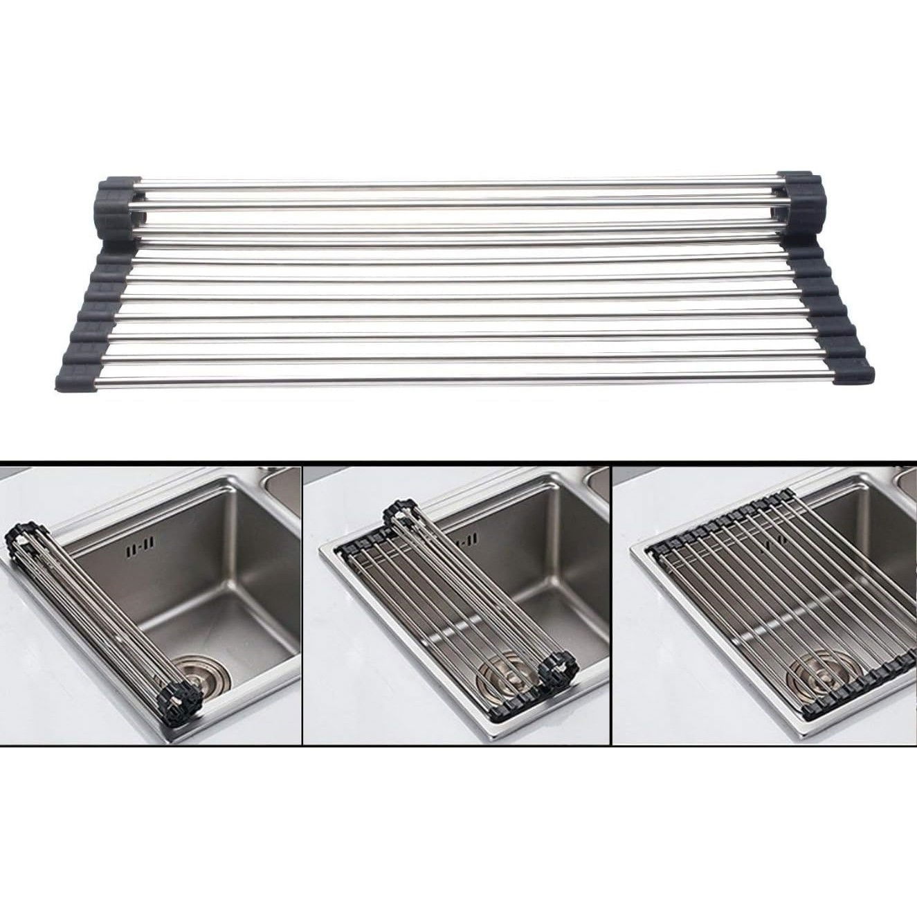 Covoras de scurgere pentru chiuveta bucatarie, din otel inoxidabil, suport chiuveta, pliabil, antiderapant, usor de curatat si de depozitat, 47x36 cm, 18 tuburi, negru