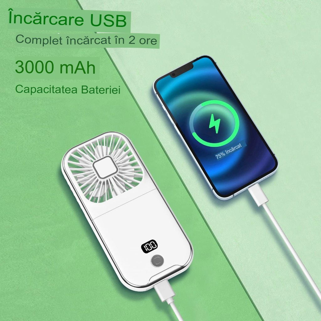 Timp de Încărcare Rapidă: Cu un timp de încărcare de doar 3 ore, ventilatorul este gata să te însoțească în orice călătorie sau moment de relaxare.